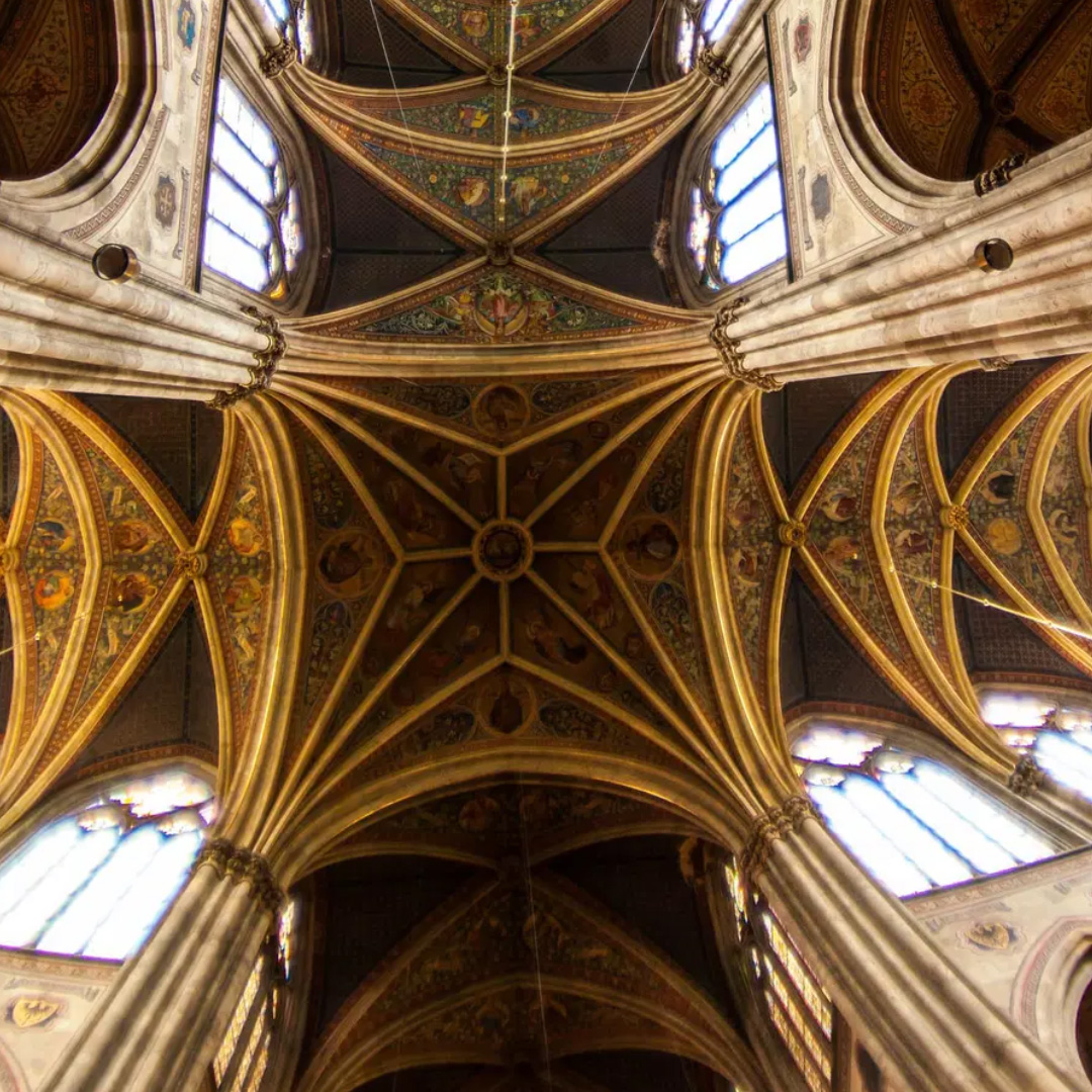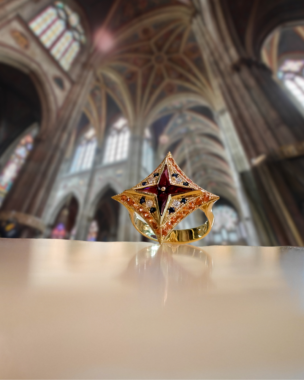 Der neugotische Baustil mit seinen Pfeilern, Arkaden, Ornamenten und der Malerei inspirierten uns zum Design eines Ringes mit Granat, Saphiren und Diamanten.